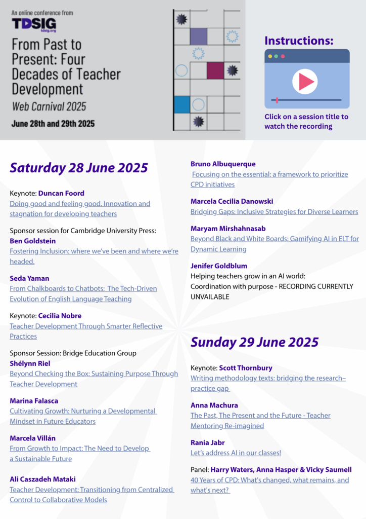 This pdf file contains the links to the recordings from the IATEFL TDSIG Web Carnival 2025. Click to download the PDF, and then click on the session titles to watch the recordings.
